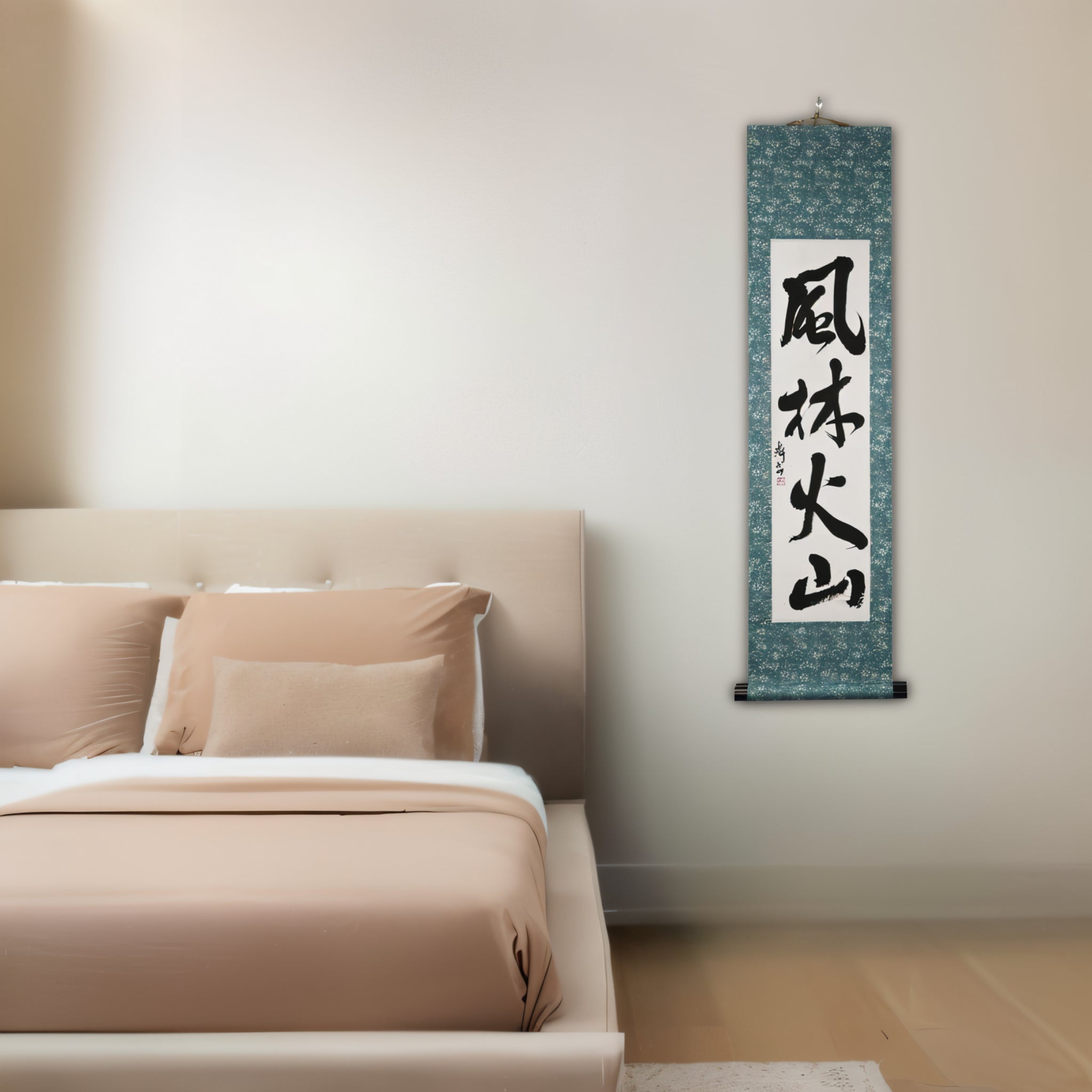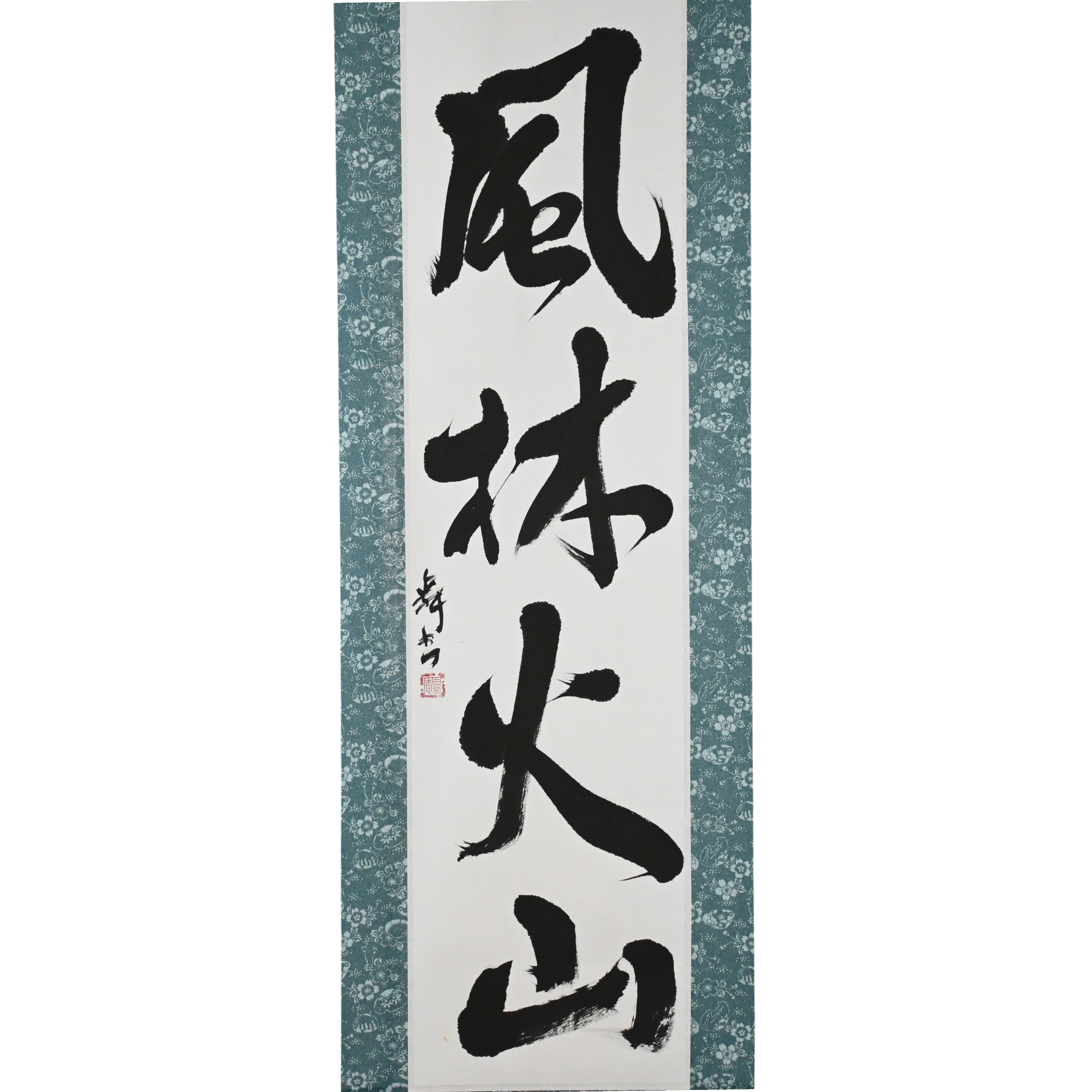 Discover the bold spirit of the Samurai with this powerful Japanese calligraphy scroll featuring 風林火山 (Fūrinkazan) — a legendary phrase immortalized by the great warlord Takeda Shingen (武田信玄), one of Japan’s most iconic figures of the Sengoku era (16th century).