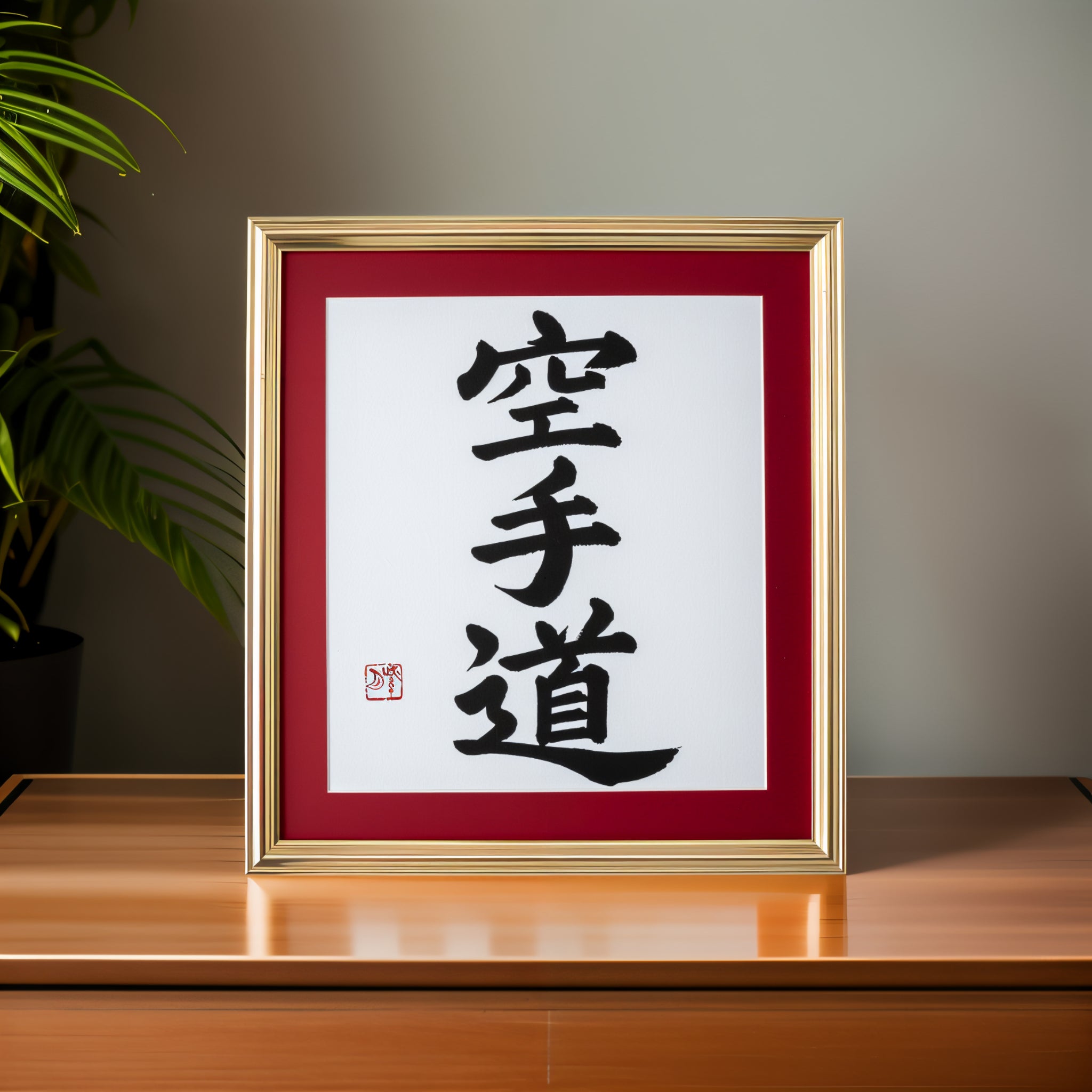 This framed calligraphy artwork features the powerful phrase 空手道 (Karate-do) — not just a martial art, but a lifelong journey of discipline, respect, and inner strength.