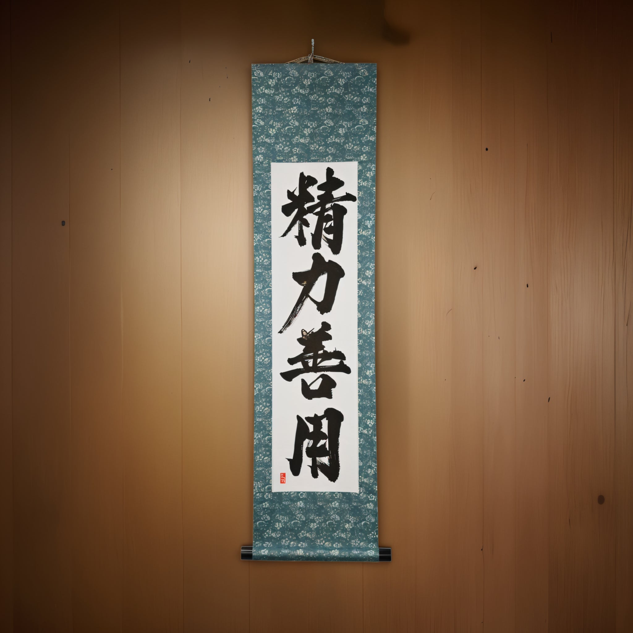 This Japanese calligraphy scroll features the timeless phrase 精力善用 (Seiryoku-Zenyō) — translated as "Maximum Efficient Use of Energy". It is one of the two core principles of Judo, alongside 自他共栄 (Jita-Kyōei, "Mutual Welfare and Benefit"), both established by Judo’s founder, Jigoro Kano (嘉納治五郎).
